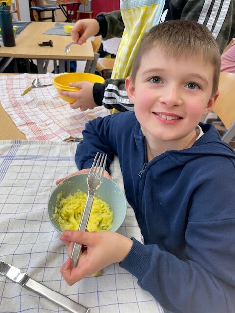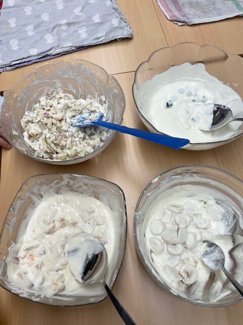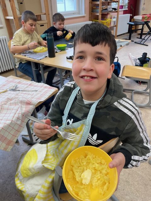 Dazu wurde in der 1. Unterrichtseinheit gemeinsam Knabbergemüse mit Dip gemacht. Es folgten Knabbergemüse mit Kräuterdip, Kartoffeln und Schlemmerquark.