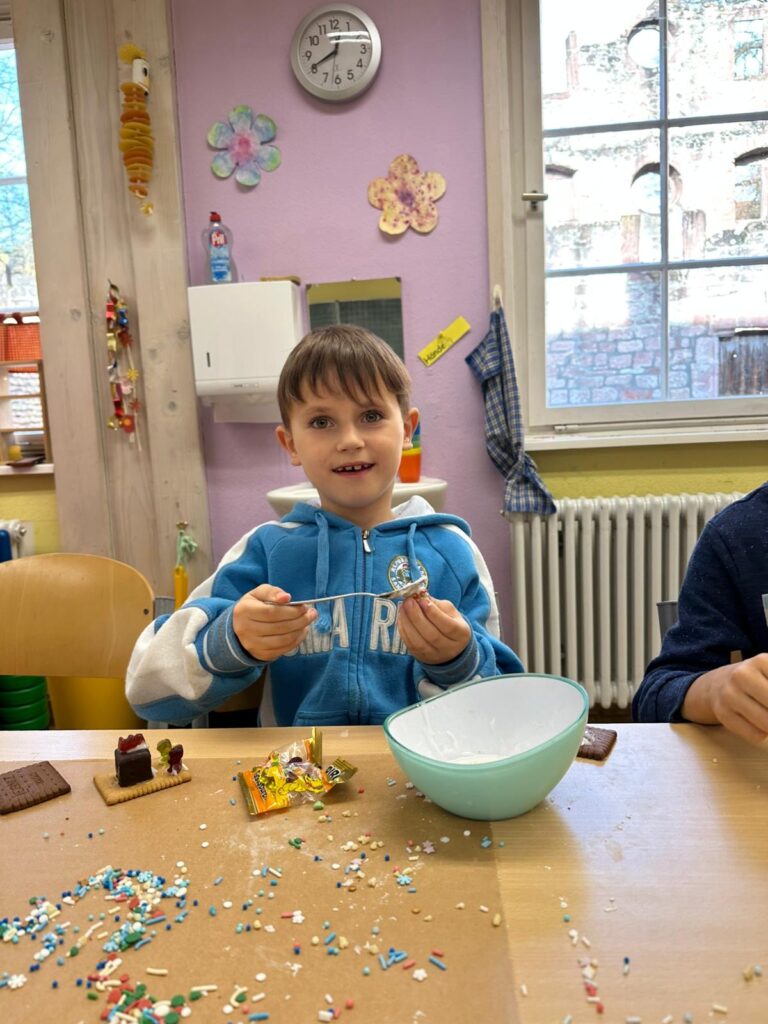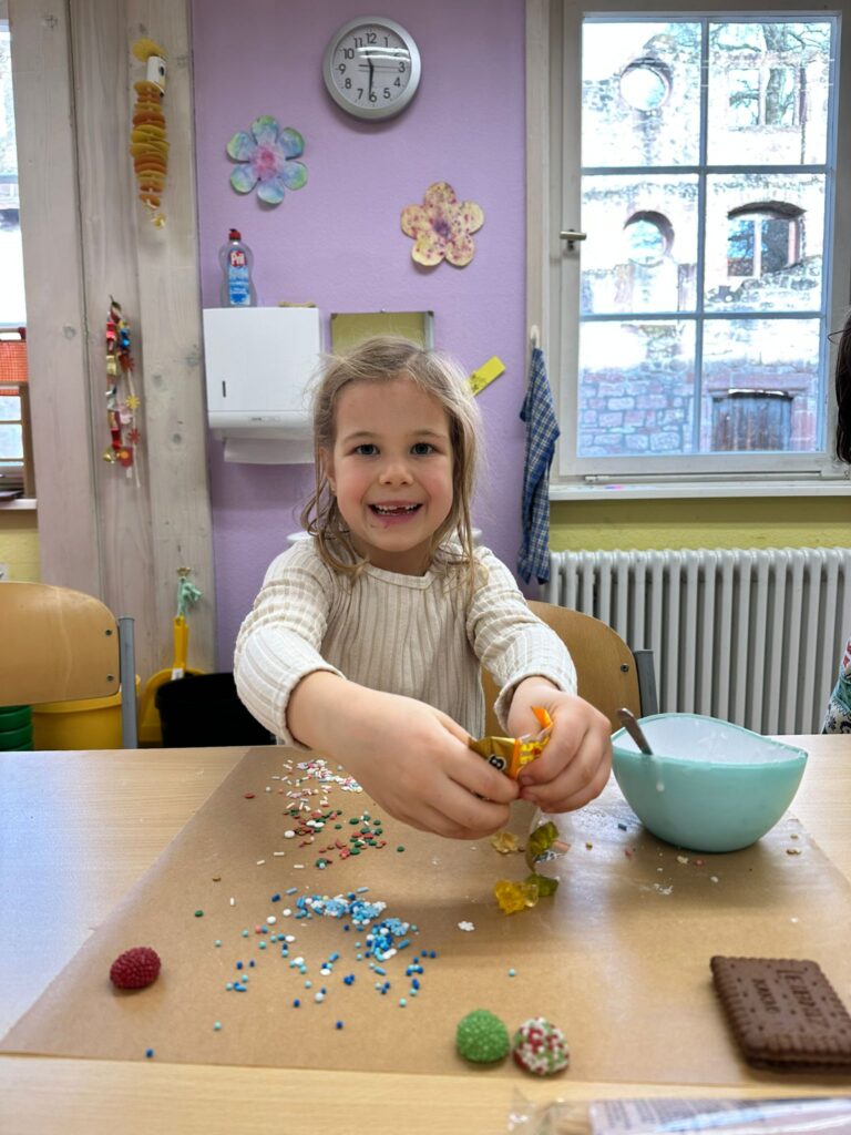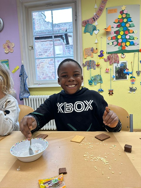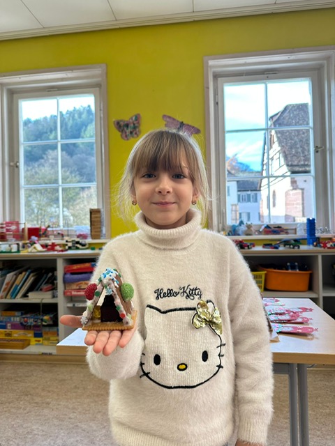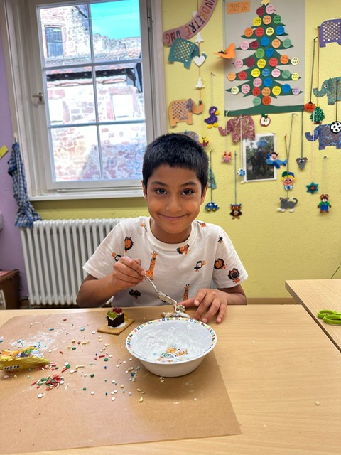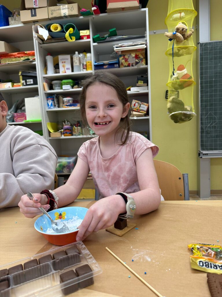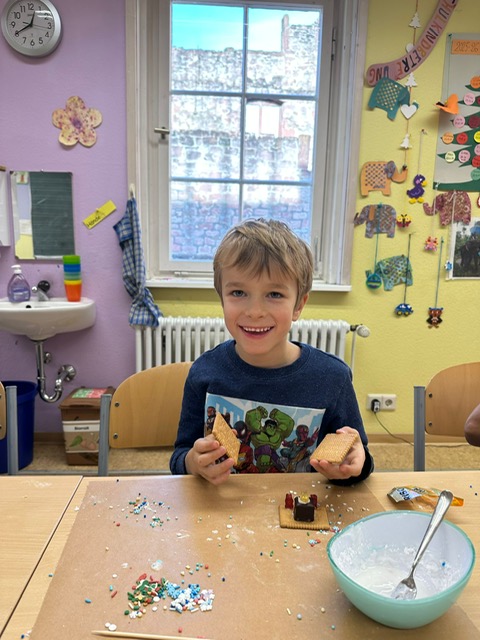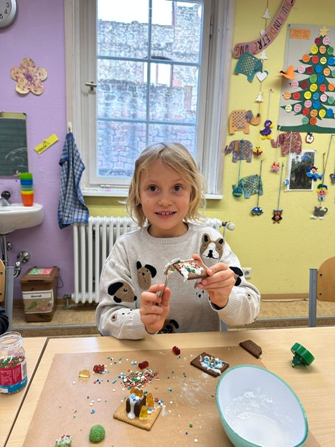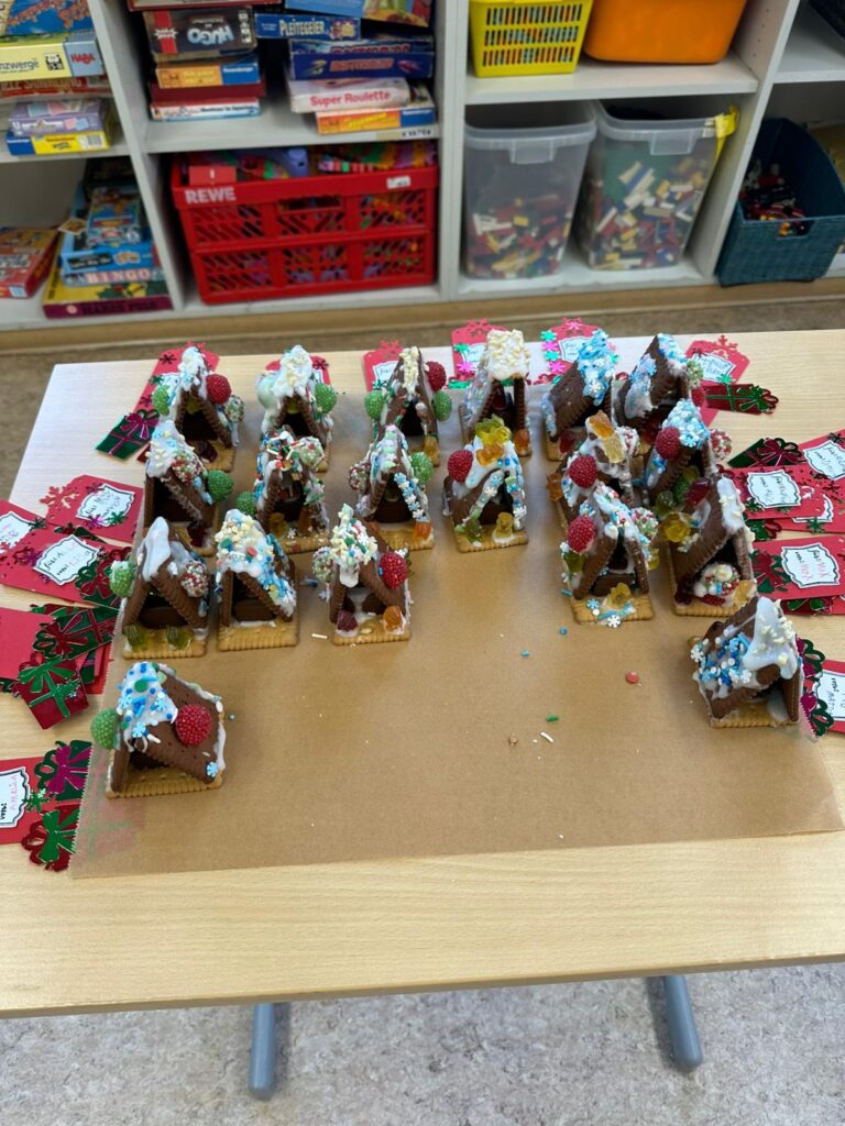 Am 3. Dezember war Frau Jung bei uns zu Besuch. Sie hat mit der Klasse 1/2 b Kekshäuser und Geschenkanhänger gebastelt. Die Kinder haben sich sehr gefreut und waren motiviert bei der Sache. Mit Zuckerguss, bunten Streuseln und viel Kreativität entstanden ganz unterschiedliche kleine Kunstwerke. Besonders schön war zu sehen, wie stolz die Kinder auf ihre Ergebnisse waren und wie viel Freude sie beim Arbeiten hatten. Vielen Dank Frau Jung für den gelungenen Bastelvormittag.